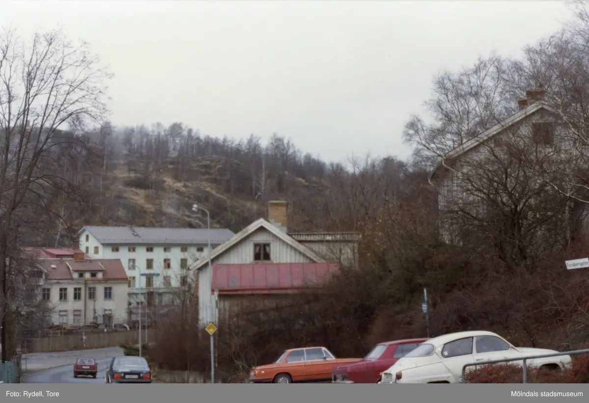 Vy från Forsåkergatan mot bebyggelse vid Gamla Torget i Mölndals Kvarnby på 1970-talet. Denna del av gatan kallas även Pelleliden.