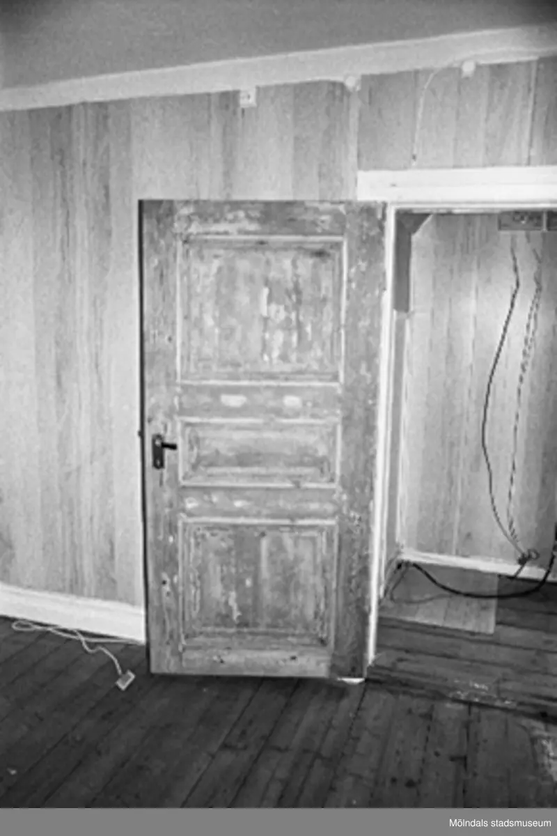 Kvarnfallet 31 i Grevedämmet, hösten 1994. Interiör från övervåningen i Röda huset, G-3. En av husets flertaliga spegeldörrar under renovering. Dörrkonstruktionen har hopfogats med träplugg.