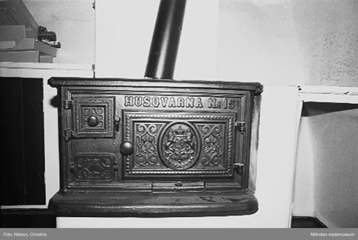 Kvarnfallet 31 i Grevedämmet, hösten 1994. Interiör från vindsvåningen i Röda huset, G-3. Bilden visar en Husqvarna järnspis nr 15 i rummet vid västra gaveln. Spisen var vid tillfället obrukbar.