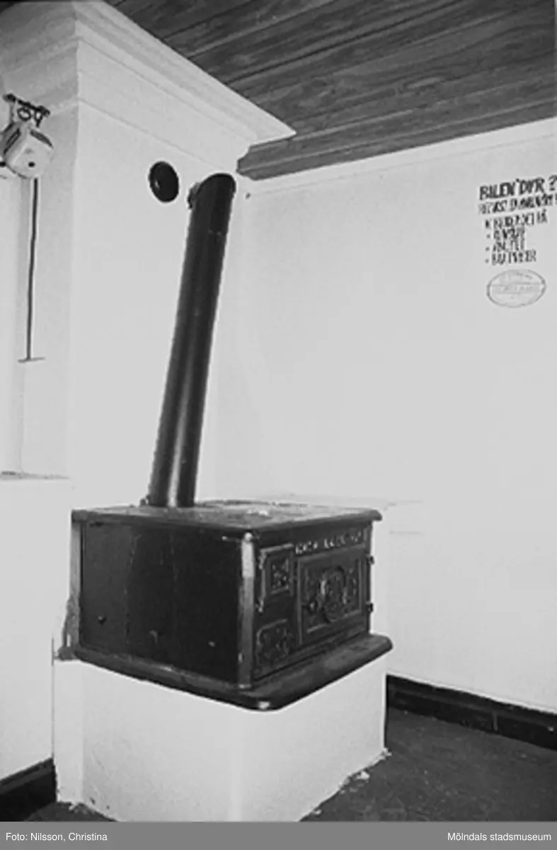 Kvarnfallet 31 i Grevedämmet, hösten 1994. Interiör från vindsvåningen i Röda huset, G-3. Bilden visar en Husqvarna järnspis nr 15 i rummet vid västra gaveln. Spisen var vid tillfället obrukbar.