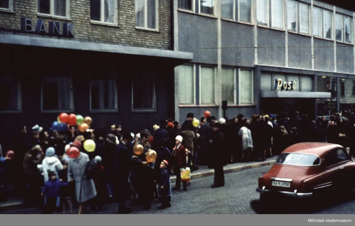 Folksamling utanför Hantverkshuset (Götabanken och postkontoret) på Frölundagatan (idag: Brogatan) i Mölndal, 1970-tal. En röd Saab 96 V4 kör västerut på den stenlagda gatan.