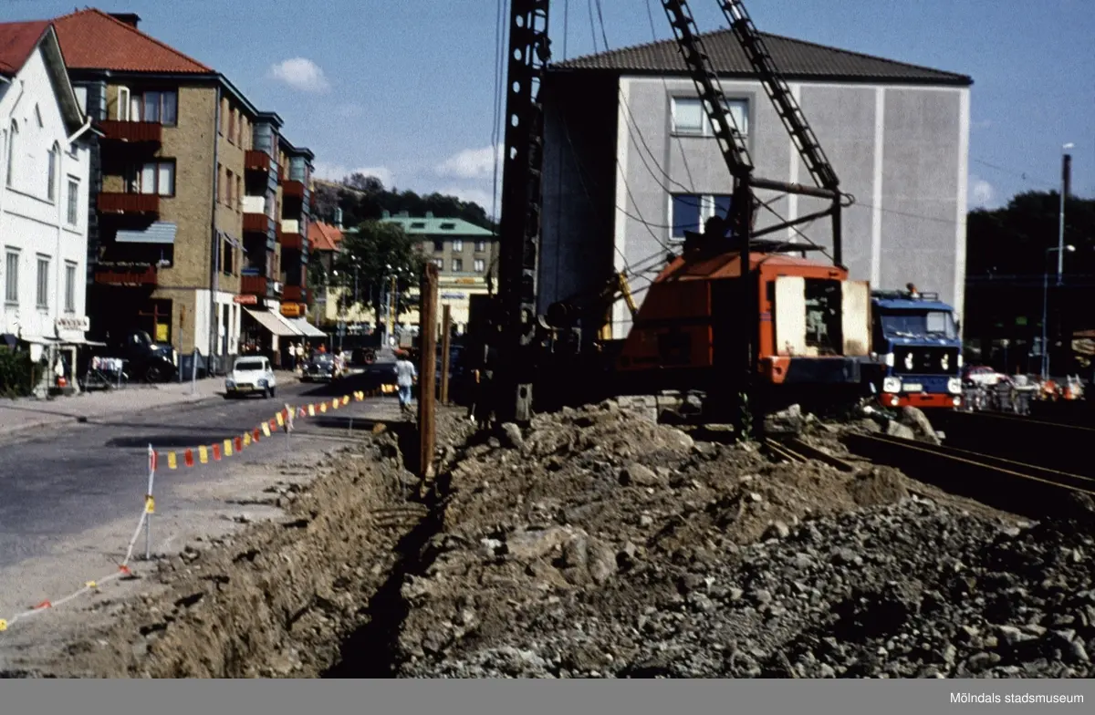 Ett pågående bygge på Frölundagatan (idag: Brogatan) i Mölndal, 1970-tal. Hantverkshuset ses till höger. I bakgrundens mitt skymtas Café Skånes och Mekonomens byggnad på Kvarnbygatan 1 (idag: Nämndemansgatan 1).