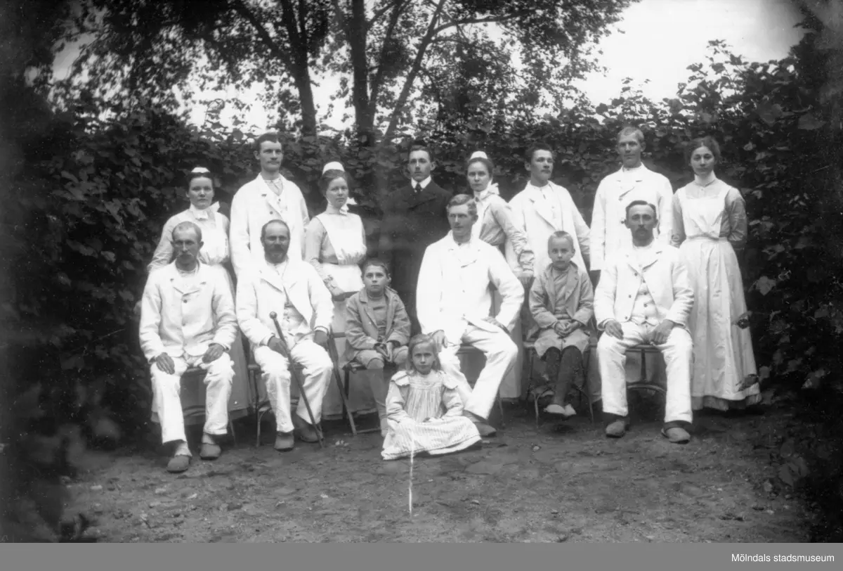 Personal och patienter uppställda utomhus vid Mölndals sjukstuga, 1910-talet.