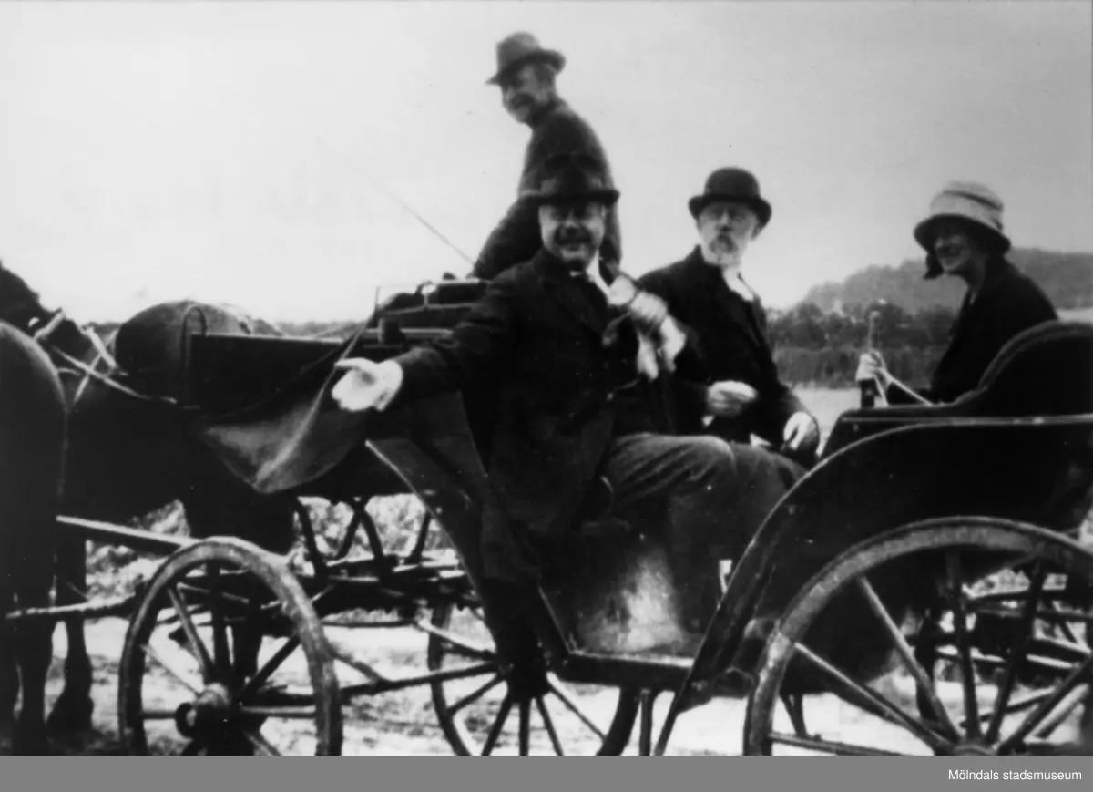 År 1920. Kusken Johan Carlsson. Oscar von Sydow 1873-1936. Landshövding 1912-1934. Edvard Rohde 1845-1932. Biskop 1888-1929. Vagnen tillhör Streteredshemmet i Kållered.