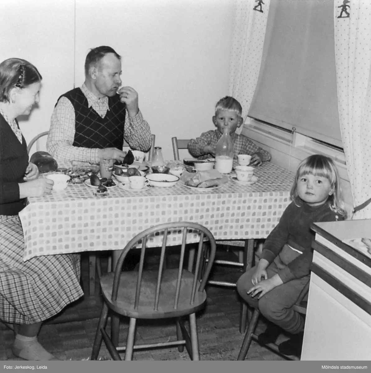 Trofina och Fedosja Jeutitonen äter kvällsmål i köket tillsammans med barnen Ulf och Marita Jerkeskog på Idunagatan 39, 1957.