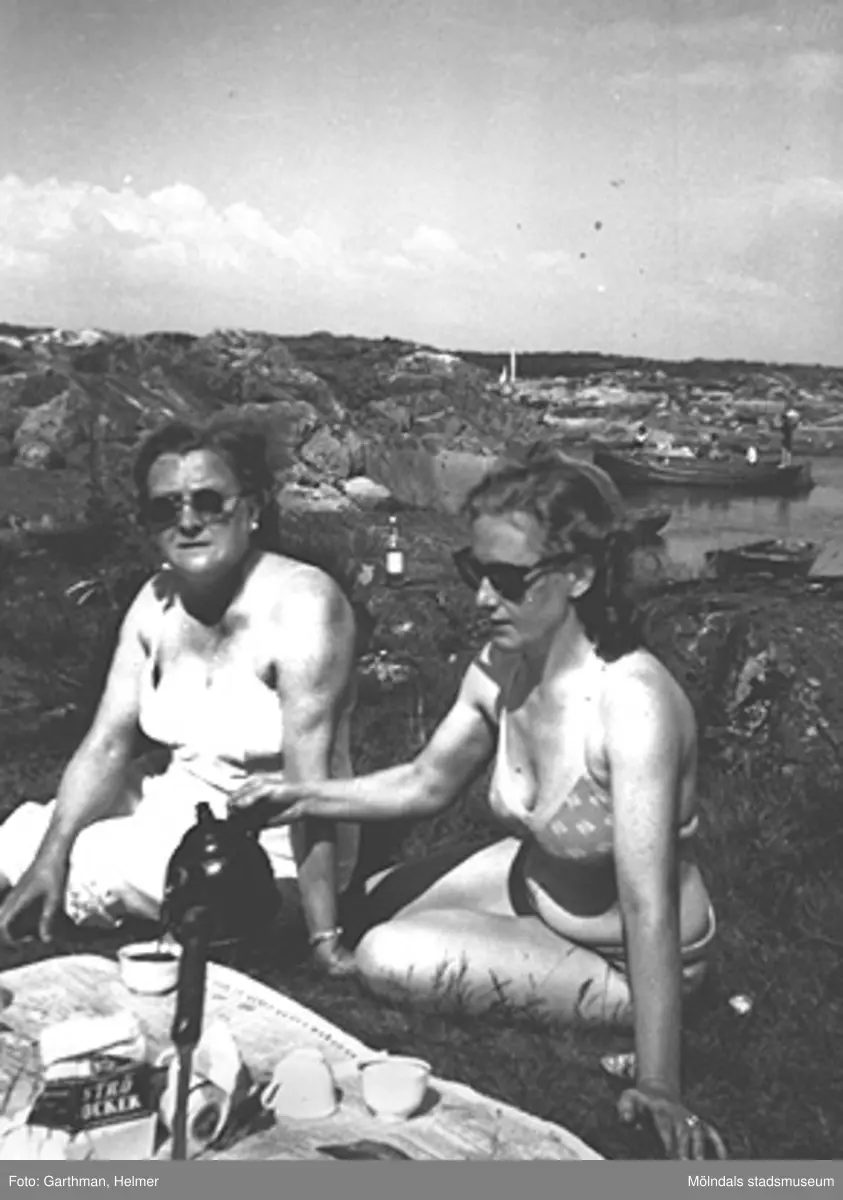Anni Magnusson och Astrid Garthman fikar bland klipporna i Näset. Tidigt 1950-tal.