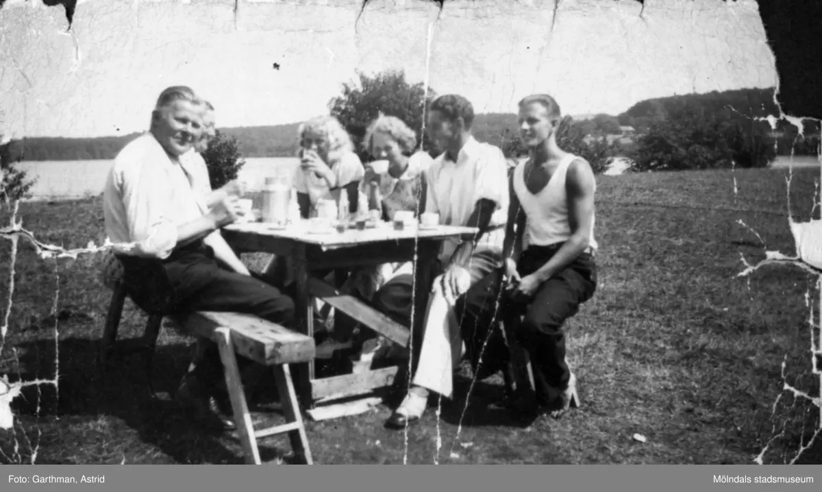 Sex personer har fikapaus vid Fjärås Bräcka, 1930-tal. Helmer Garthman sitter längst till höger.