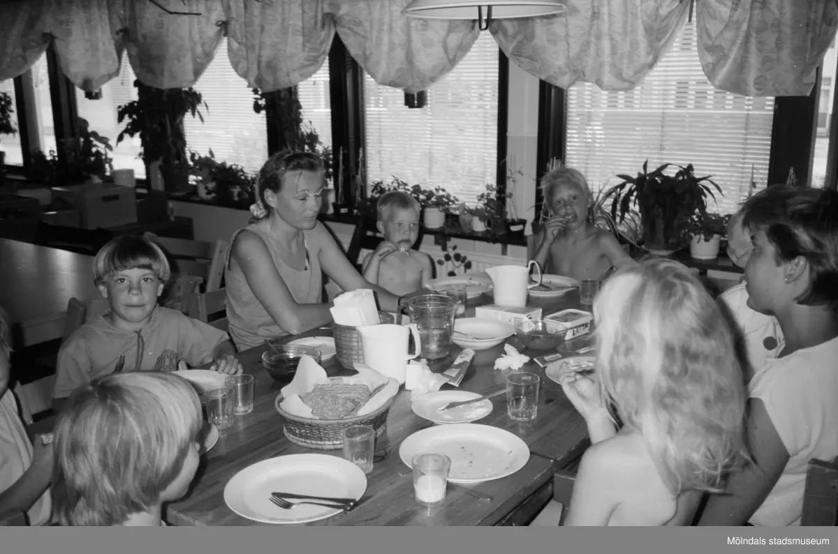 Vuxna och barn sitter vid köksbordet och har ätit mat. Porslin står kvar på bordet. Det verkar vara varmt ute för de har inte så mycket klädder på sig. Katrinebergs daghem, 1992.