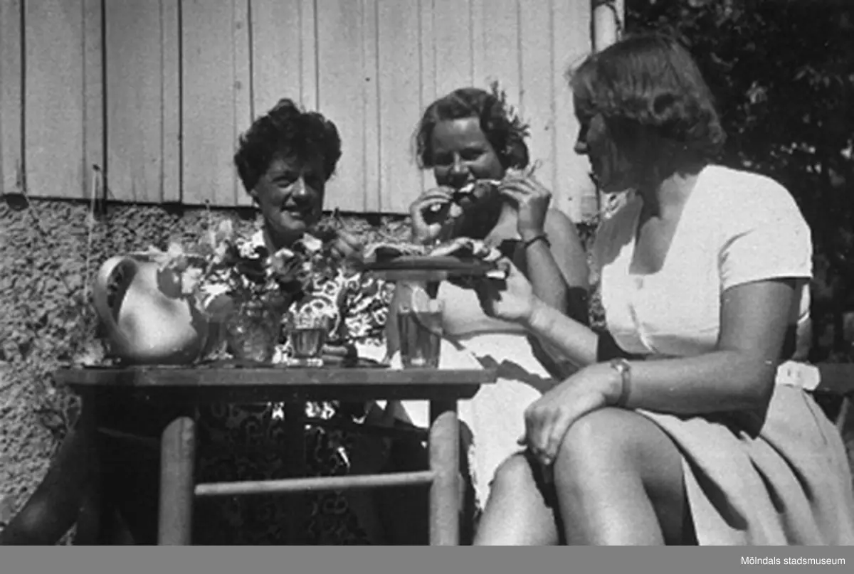 Tre lärare fikar vid Krokslätts daghem, Dalhemgatan 7 i Krokslätt, 1948 - 1951.