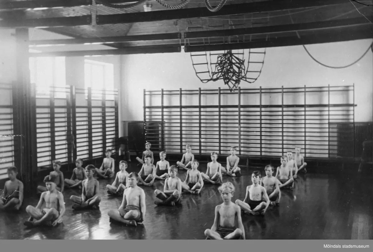 Pojkar i gymnastiksal på Krokslättsskolan. De sitter på led med korslagda ben.