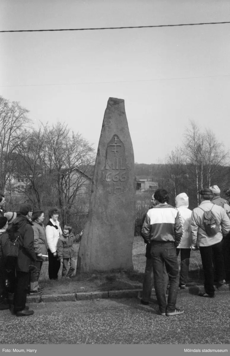 Lindome Hembygdsgille anordnar sockenvandring i Lindome, år 1983. En samling människor vid Brostenen i Annestorp.