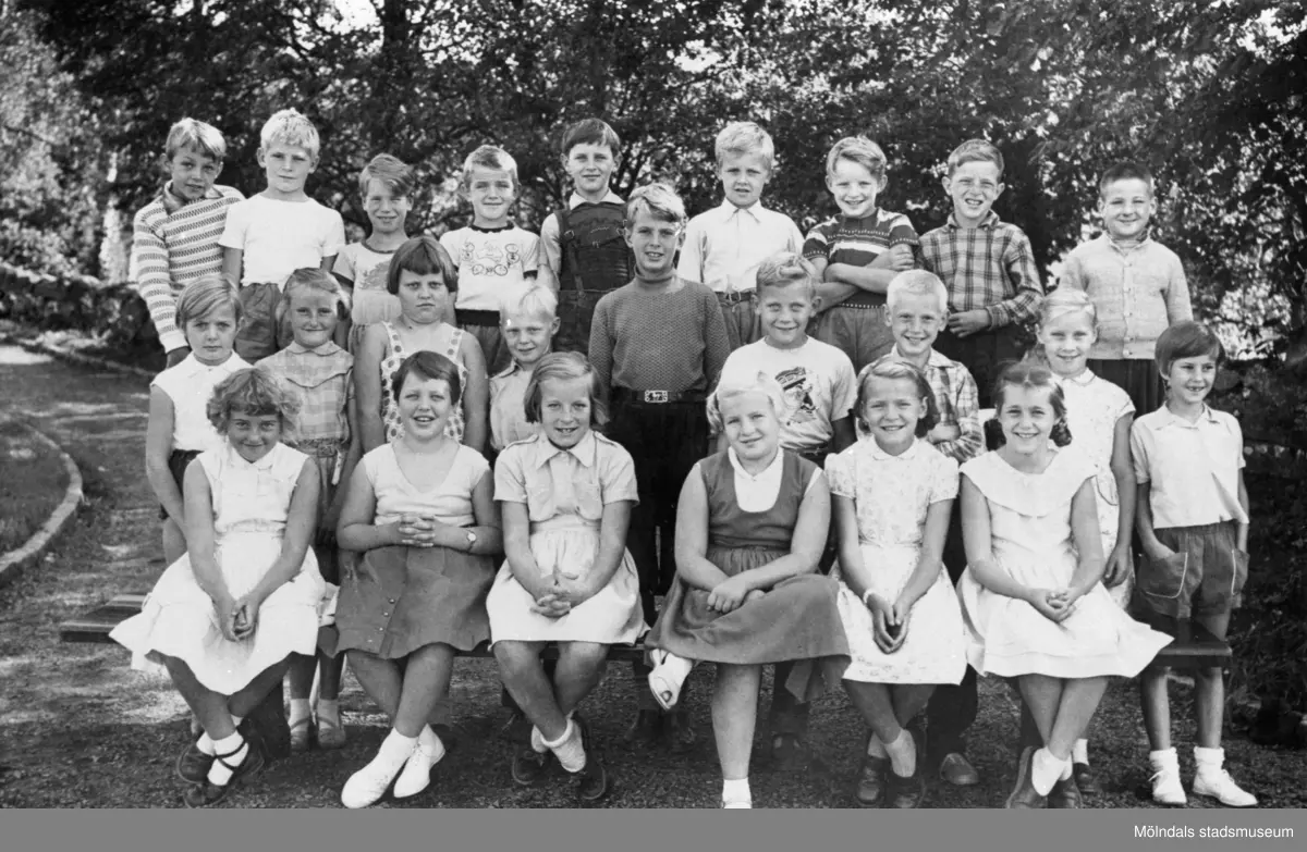 Skolklass fotograferad ute i det gröna 1955-1956. Centralskolan (nuv. Kyrkskolan).