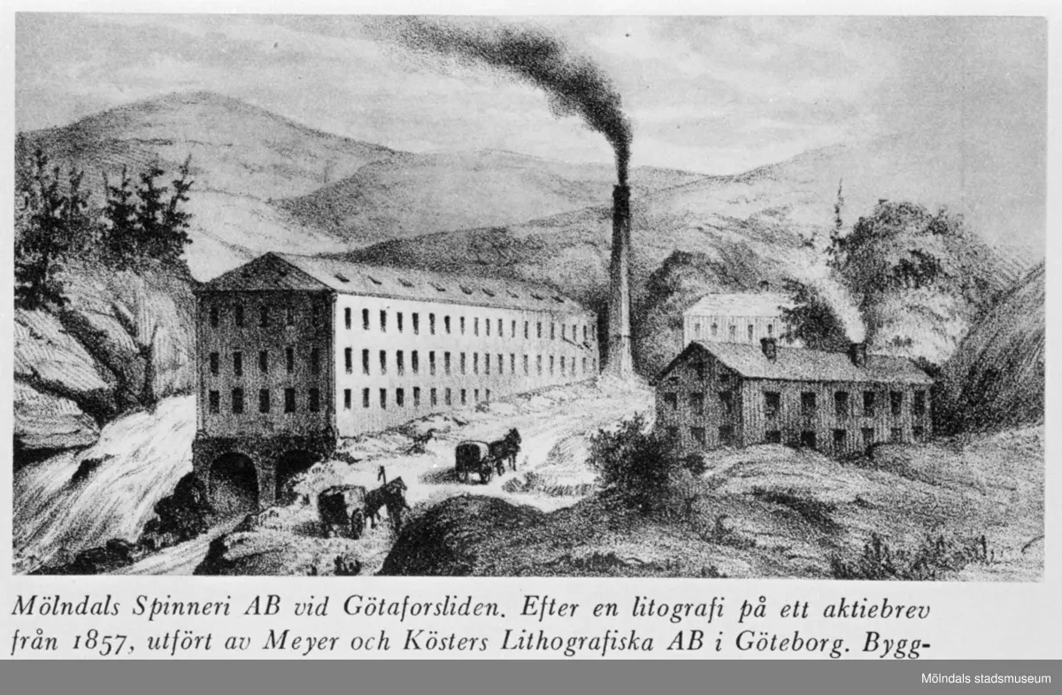 Litografi på aktiebrev avbildat i Torsten Althins Papyrus 1895-1945, Mölndal 1945. Text på kortet: Mölndals Spinneri AB vid Götaforsliden. Efter en litografi på ett aktiebrev från 1857, utfört av Meyer och Kösters Lithografiska AB i Göteborg. Byggnaden ingirck från 1870 i Rosendahlsverken och inrymde den första cellulosafabriken i Mölndal. - Aktiebrevet tillhör Papyrus.