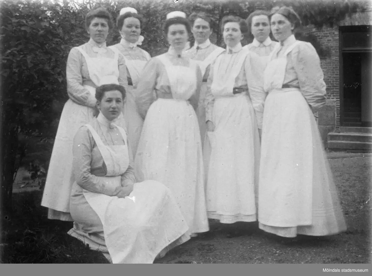 Personal utanför sjukstugan, 1909. Fr.v. Hilma Kjellberg, Julia Karlsson, Elin Hedberg, Hedvig Lundin, Alma Johansson, Ingeborg Horss, Ebba Svedberg. Längst