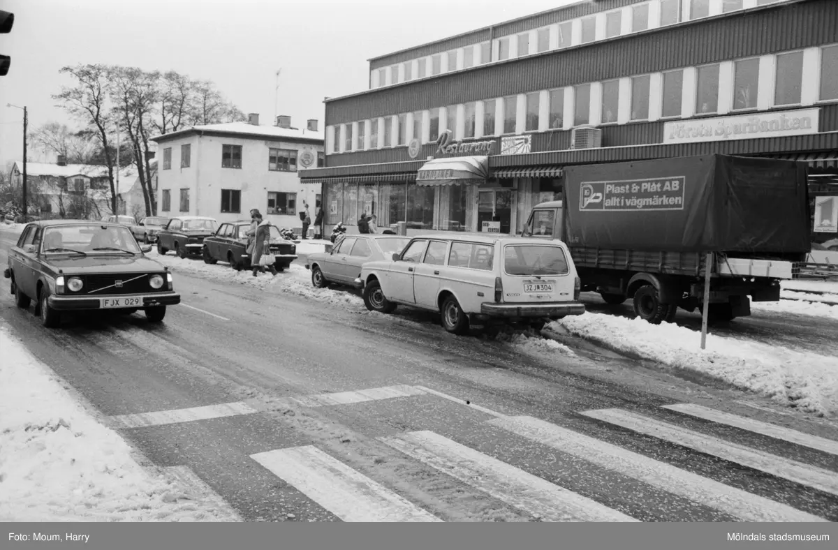 Trafik på Gamla Riksvägen i Kållered, år 1984. På högra sidan vägen ses närmast Posthuset, Gamla Riksvägen 48.
