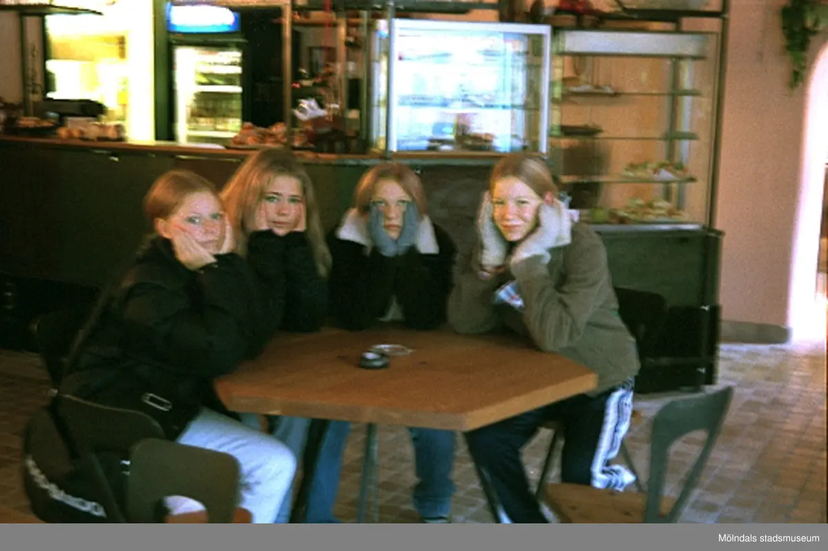 Titel: Fyra ungdomar sitter vid ett bord i ett café. Mölndalsbro i dag - ett skolpedagogiskt dokumentationsprojekt på Mölndals museum under oktober 1996. 1996_1283-1300 är gjorda av högstadieelever från Åbyskolan 8A, grupp 3. Se även 1996_0913-0940, gruppbilder på klasserna 1996_1382-1405 och bilder från den färdiga utställningen 1996_1358-1381.