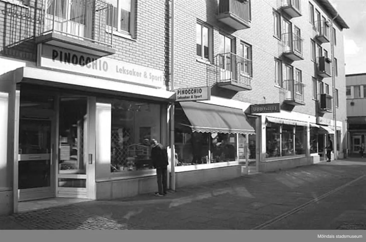 Pinocchio Leksaker & Spel på Medborgaregatan. Mölndalsbro i dag - ett skolpedagogiskt dokumentationsprojekt på Mölndals museum under oktober 1996. 1996_ 0931-0940 är gjorda av högstadieelever från Kvarnbyskolan 9A, grupp 2. Se även gruppbilder på klasserna 1996_1382-1405 och bilder från den färdiga utställningen 1996_1358-1381.