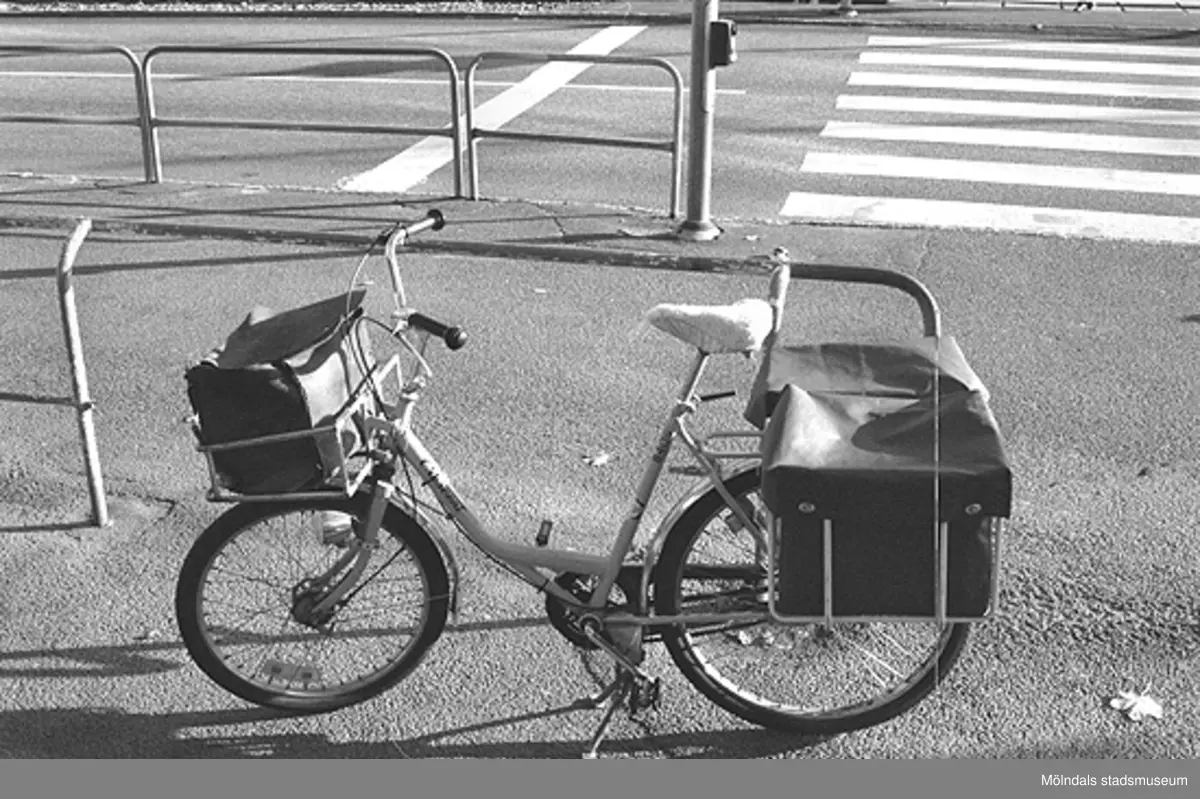 En parkerad postcykel vid ett övergångsställe. Mölndalsbro i dag - ett skolpedagogiskt dokumentationsprojekt på Mölndals museum under oktober 1996. 1996_1042-1051 är gjorda av högstadieelever från Kvarnbyskolan 9C, grupp 2. Se även 1996_0913-0940, gruppbilder på klasserna 1996_1382-1405 samt bilder från den färdiga utställningen 1996_1358-1381.