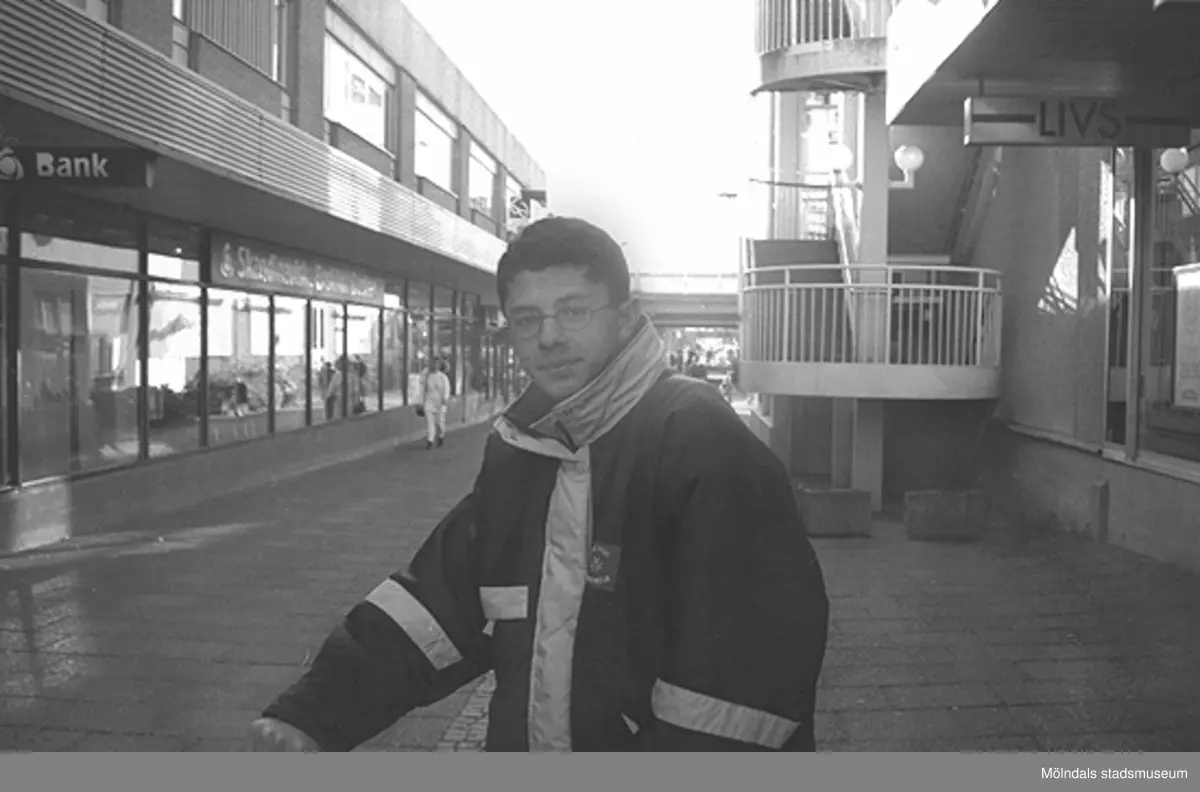 En kille som står på Nygatan. Mölndalsbro i dag - ett skolpedagogiskt dokumentationsprojekt på Mölndals museum under oktober 1996. 1996_1079-1097 är gjorda av högstadieelever från Kvarnbyskolan 9C, grupp 4. Se även 1996_0913-0940, gruppbilder på klasserna 1996_1382-1405 samt bilder från den färdiga utställningen 1996_1358-1381.