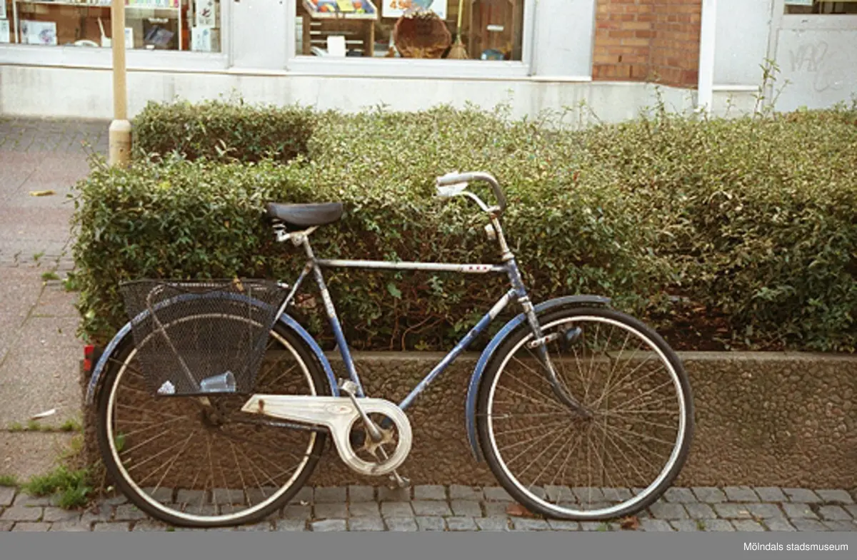 En parkerad herrcykel som har punktering. Mölndalsbro i dag - ett skolpedagogiskt dokumentationsprojekt på Mölndals museum under oktober 1996. 1996_1116-1134 är gjorda av högstadieelever från Kvarnbyskolan 9C, grupp 6. Se även 1996_0913-0940, gruppbilder på klasserna 1996_1382-1405 samt bilder från den färdiga utställningen 1996_1358-1381.