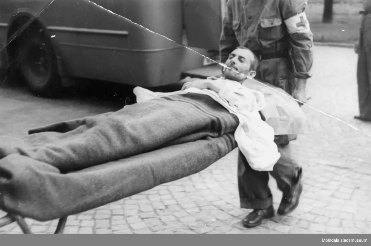 Manlig flykting på bår, buren av Röda Korsets personal.