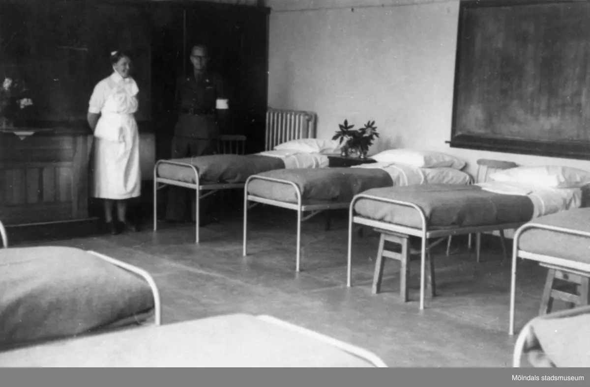 En sovsal med sängar samt en sköterska och en man från Röda Korset.