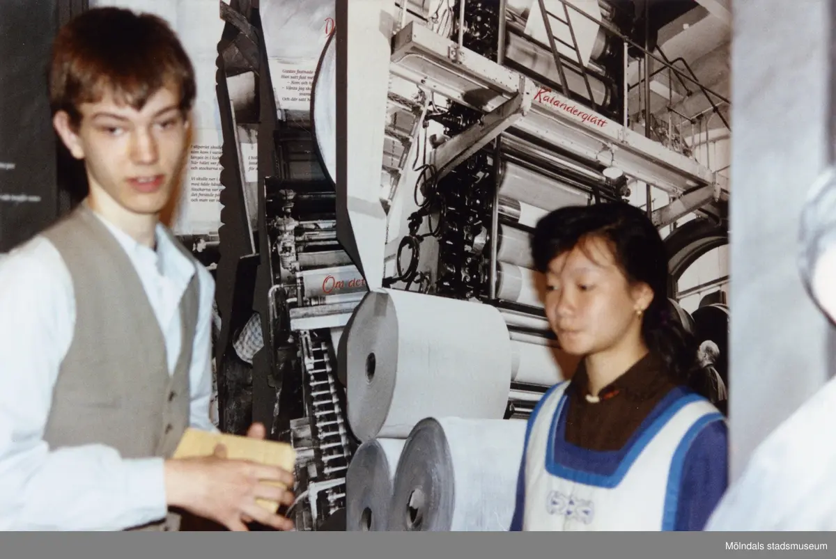 Foton från projektet "Museet - ett scenrum", 1990-tal. Klass 8A från Kvarnbyskolan dramatiserar i utställningen "Andra skiftet går på" med Papyrus historia som var en del av Mölndals museums basutställning t.o.m. år 2001.