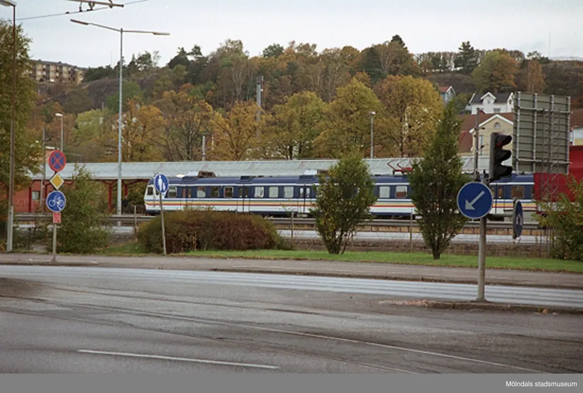 Vy österut över Göteborgsvägen på pendeln mot Göteborg. Mölndalsbro i dag - ett skolpedagogiskt dokumentationsprojekt på Mölndals museum under oktober 1996. 1996_1264-1282 är gjorda av högstadieelever från Åbyskolan 8A, grupp 2. Se även 1996_0913-0940, gruppbilder på klasserna 1996_1382-1405 och bilder från den färdiga utställningen 1996_1358-1381.