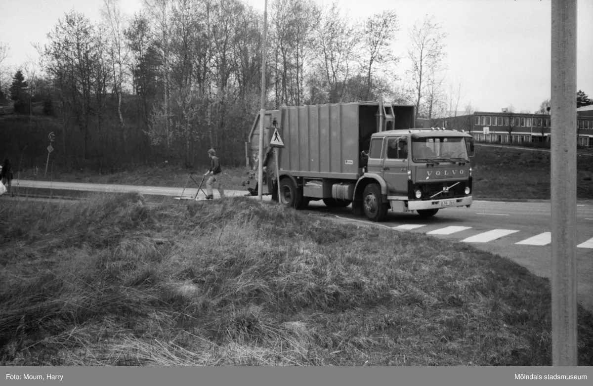 Annestorpsdalens scoutkår städar i Lindome centrum med angränsande områden, år 1984. Sopbil på Industrivägen.