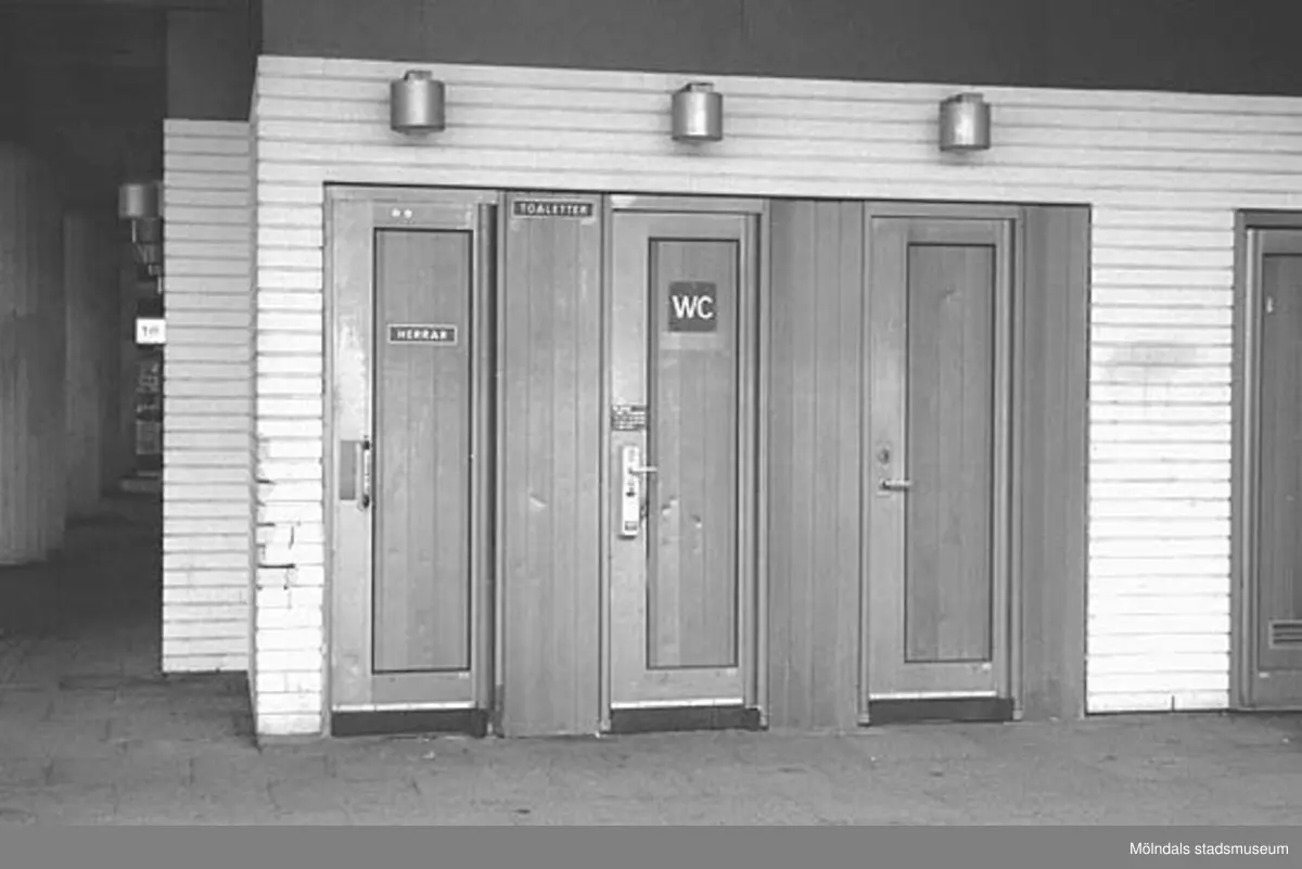 Allmänna toaletter placerade under bron. Mölndalsbro i dag - ett skolpedagogiskt dokumentationsprojekt på Mölndals museum under oktober 1996. 1996_0913-0930 gjorda av högstadieelever från Kvarnbyskolan 9A, grupp 1. Se även gruppbilder på klasserna 1996_1382-1405 och bilder från den färdiga utställningen 1996_1358-1381.