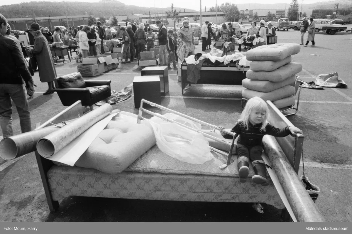 Lindome Frikyrkoförsamlings ungdomssektion håller sin årliga loppmarknad i Lindome centrum, år 1983.