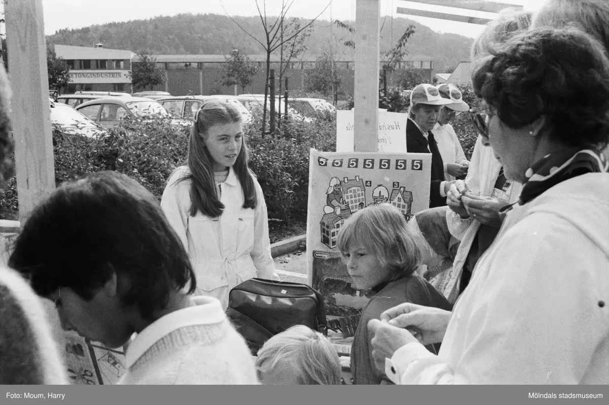 Lindome Frikyrkoförsamlings ungdomssektion håller sin årliga loppmarknad i Lindome centrum, år 1983.