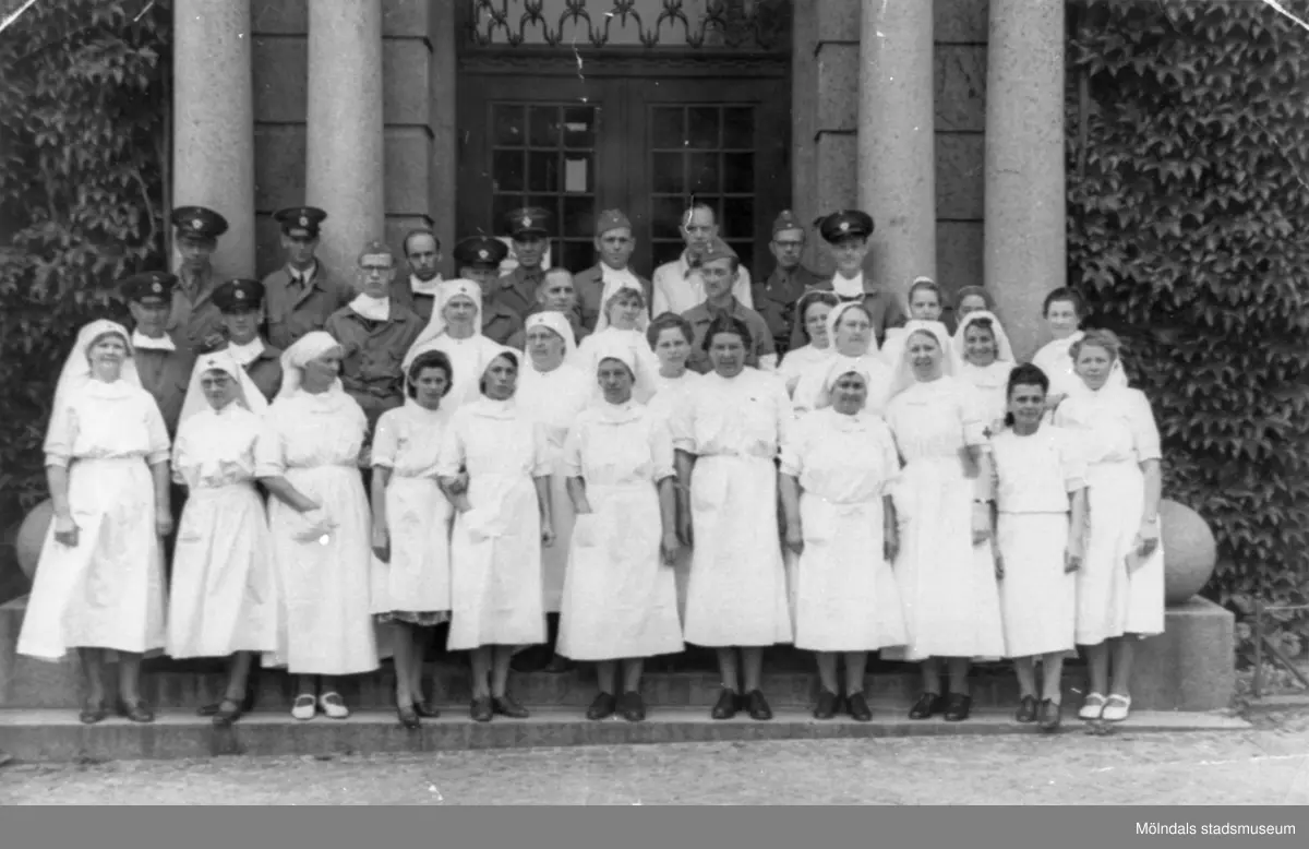 Röda korsets personal, som skall sköta flyktingar från koncentrationsläger i Kvarnbyskolan, för tillfället omdanad till karantänsförläggning. Personalen är fotograferad framför Kvarnbyskolans