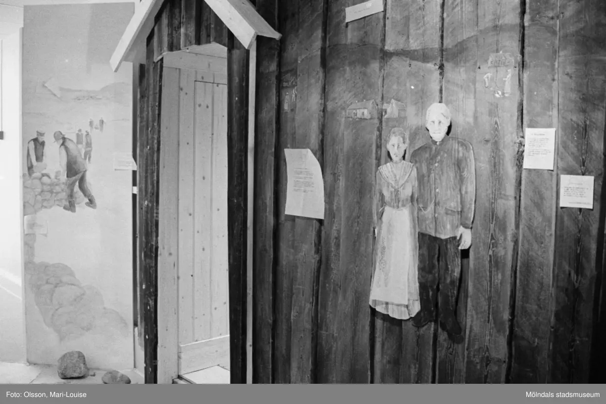 Interiörbilder från Mölndals museums basutställning under dess uppbyggnad år 1987. Snickeriarbeten i museet.