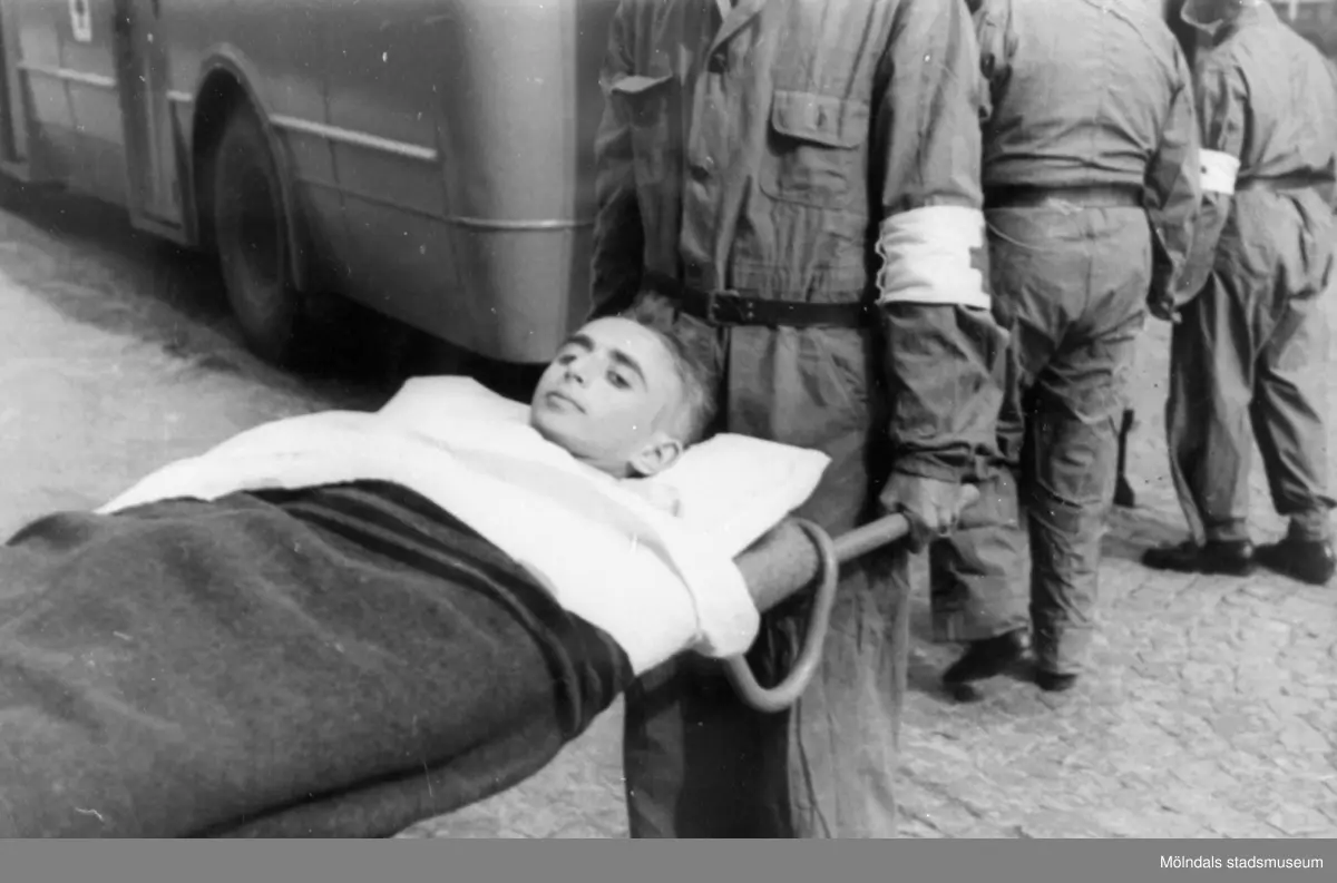En före detta fånge från ett koncentrationsläger bärs på bår av Röda korsets personal in i Kvarnbyskolan, som då var karantänsförläggning. Man ser Alléns stenläggning, 1945.