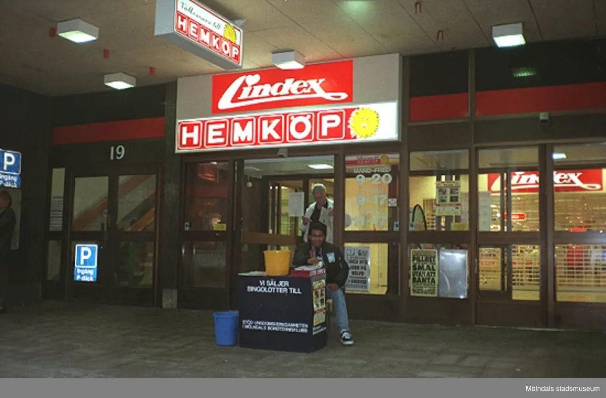 Bingolottoförsäljning på Brogatan 19 utanför Lindex och Hemköp. Mölndalsbro i dag - ett skolpedagogiskt dokumentationsprojekt på Mölndals museum under oktober 1996. 1996_1212-1226 är gjorda av högstadieelever från Kvarnbyskolan 9D, grupp 5. Se även 1996_0913-0940.