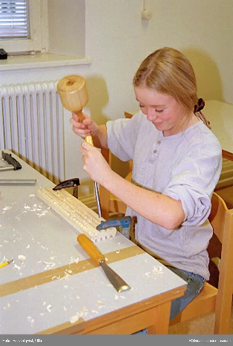 Pedagogisk verksamhet i samband med tillfällig utställning "Lindomemöbler". Bildhuggeri och ådermålning (Almåsskolan klass 8). Se även 1994_0998-1994_1034 samt 1994_1046-1994_1061.
