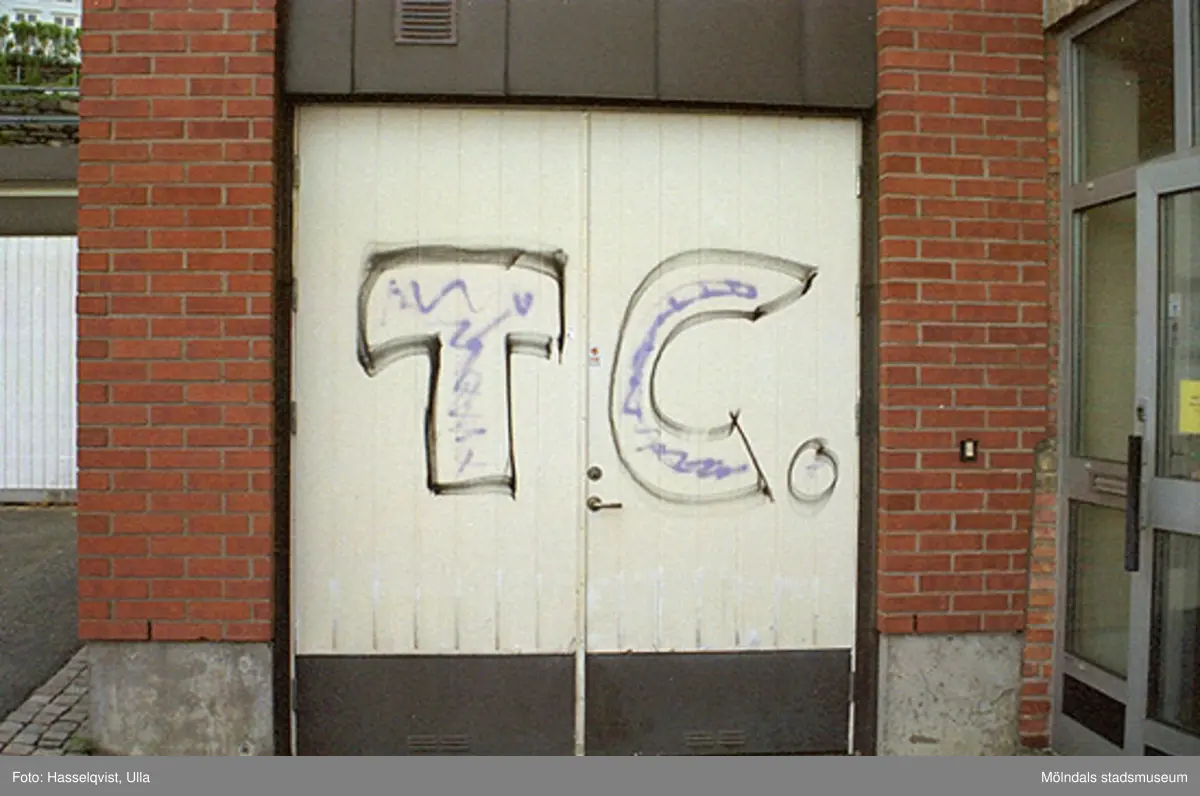Någon har klottrat "TC." på Mölndals museums garage, Norra Forsåkersgatan 19, våren 1998. Hör ihop med: 2002_0138 - 0139.