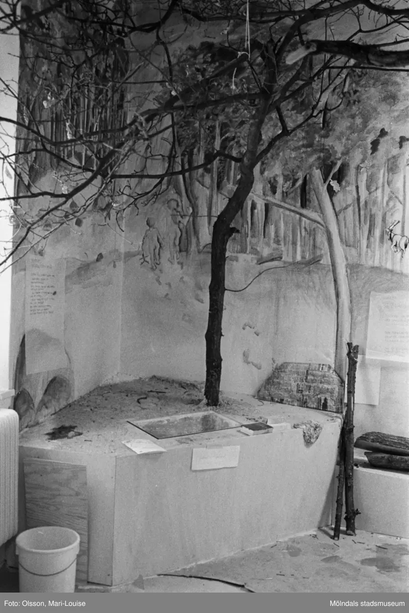 Interiörbilder från Mölndals museums basutställning under dess uppbyggnad år 1987. Snickeriarbeten i museet.