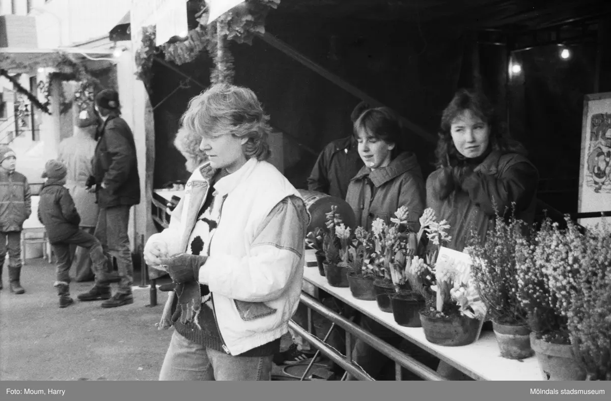 Julmarknad i Hällesåker, år 1984. "Anna och Lena sålde lotter i tombolan där man kunde vinna julblommor."