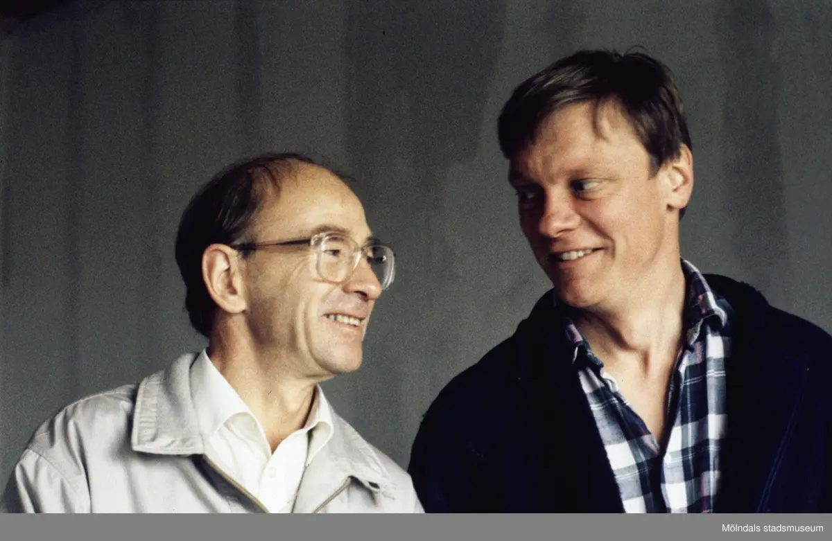 Från ombyggnationen av gamla polishuset till museum på Norra Forsåkersgatan 19 (Kallkällan 1) år 1985. Mannen till vänster är Leif Dolff från Mölndals fastighetskontor och mannen till höger var förman.