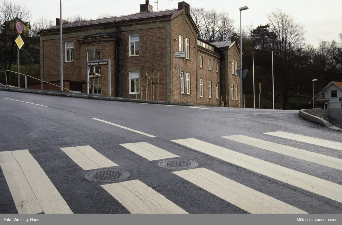 Vy från ett övergångsställe på Forsåkersgatan 19 (Kallkällan 1) år 1987. Den 22 april 1997 döptes Forsåkersgatan om till Norra Forsåkersgatan. Mölndals Museum fanns då i lokalerna som tidigare hade varit både sjukhus och polisstation.