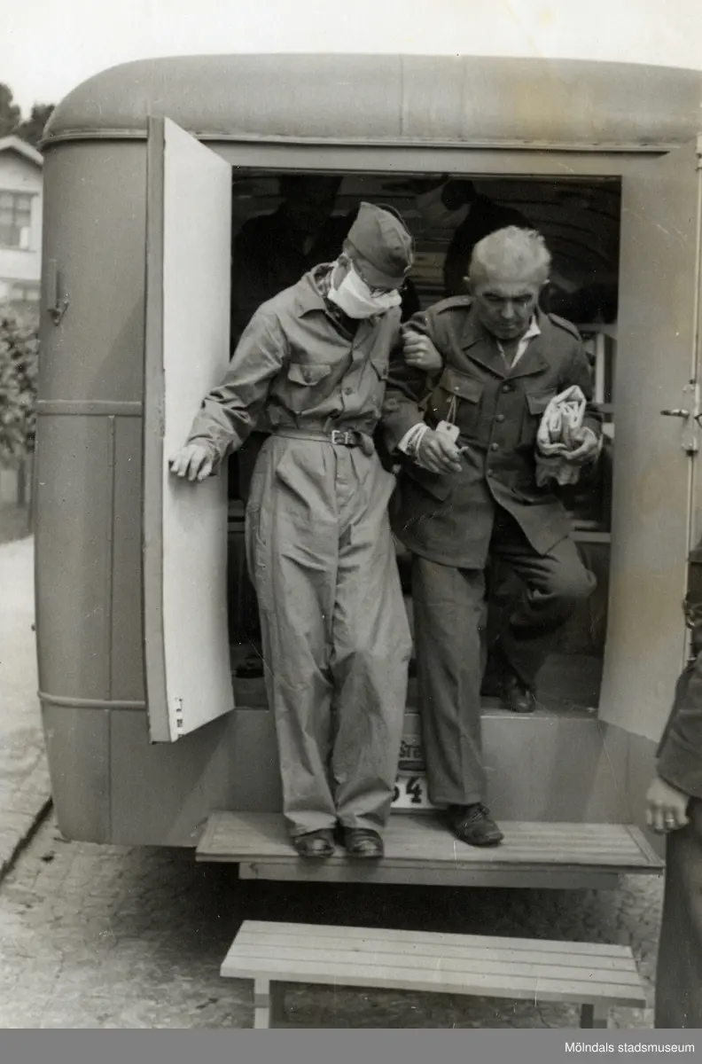 "Karantänsförläggning" på Kvarnbyskolan för flyktingar från koncentrationsläger i Tyskland 1945. En manlig flykting får hjälp ut ur ett fordon av Röda Korsets personal.