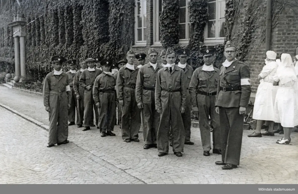 "Karantänsförläggning" på Kvarnbyskolan för flyktingar från koncentrationsläger i Tyskland 1945. Grupporträtt av Röda Korsets personal.