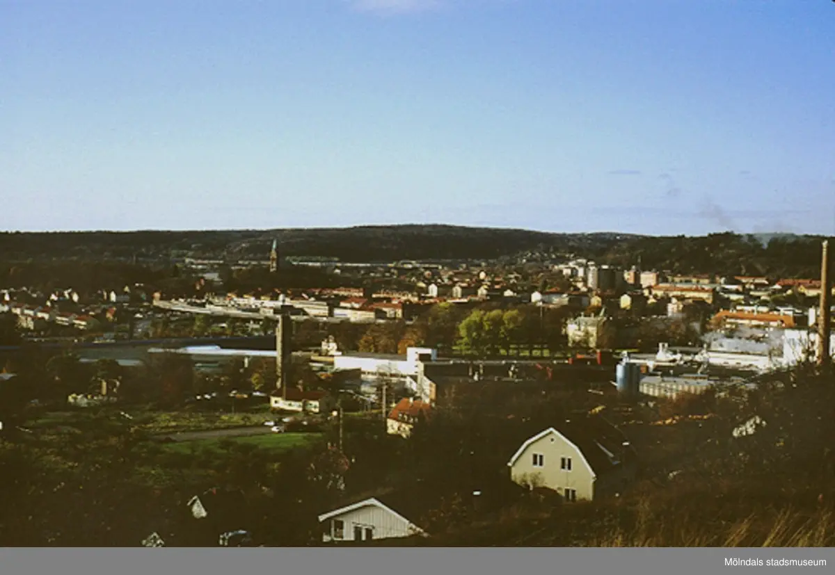 Utsikt från Klevgatan över Brännås, Papyrusområdet och Mölndals centrum. Fässbergs kyrka ses i bakgrunden, oktober 1993.