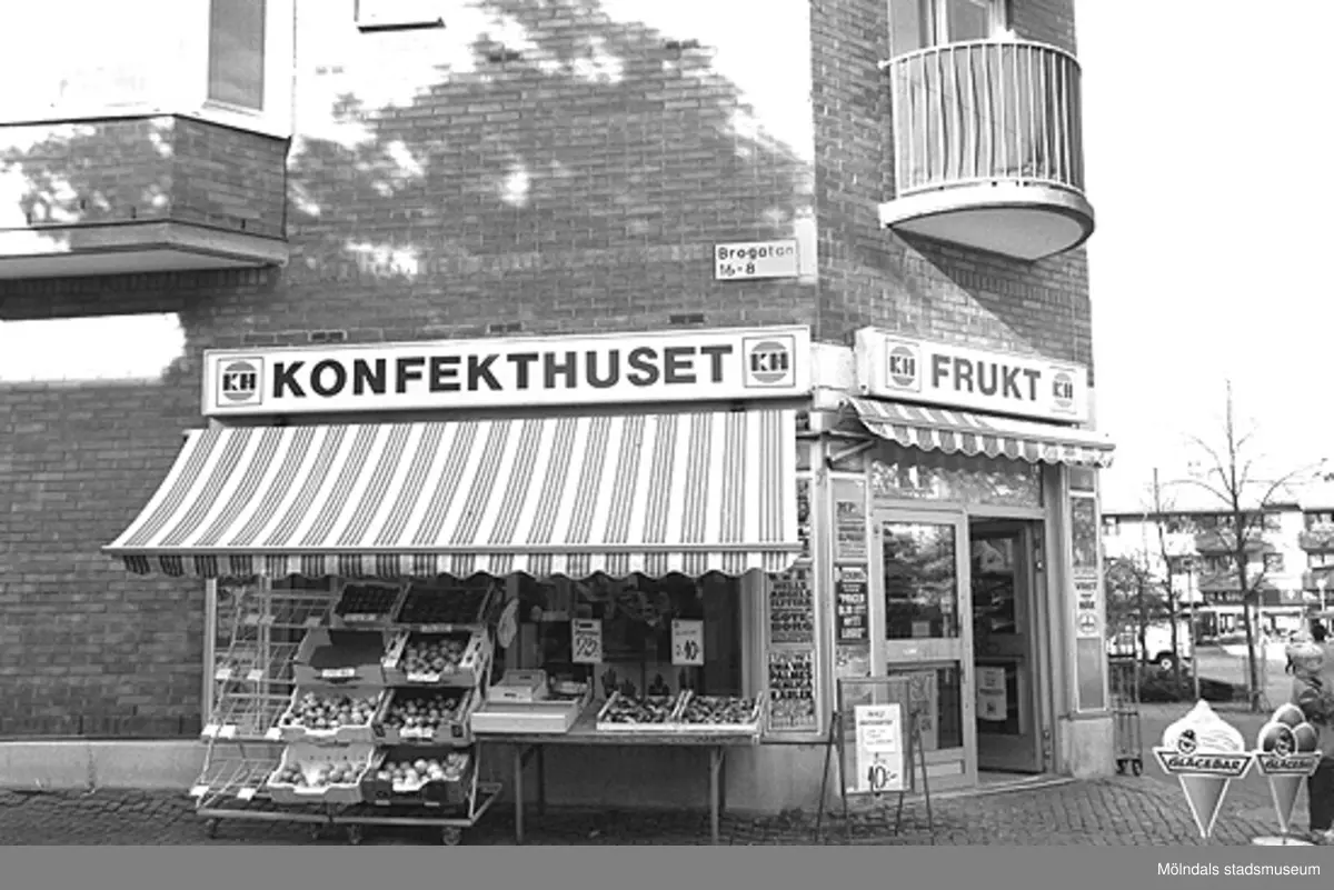 Konfekthuset vid Brogatan/Alberts torg. Mölndalsbro i dag - ett skolpedagogiskt dokumentationsprojekt på Mölndals museum under oktober 1996. 1996_1005-1023 är gjorda av högstadieelever från Kvarnbyskolan 9A, grupp 6. Se även 1996_0913-0940, gruppbilder på klasserna 1996_1382-1405 samt bilder från den färdiga utställningen 1996_1358-1381.