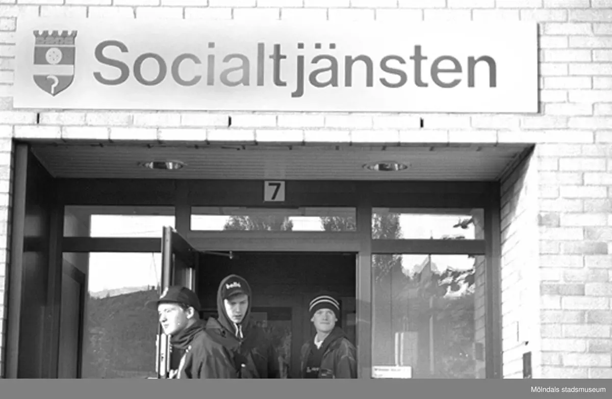 Entré till Socialtjänsten vid Göteborgsvägen. Mölndalsbro i dag - ett skolpedagogiskt dokumentationsprojekt på Mölndals museum under oktober 1996. 1996_1024-1041 är gjorda av högstadieelever från Kvarnbyskolan 9C, grupp 1. Se även 1996_0913-0940, gruppbilder på klasserna 1996_1382-1405 samt bilder från den färdiga utställningen 1996_1358-1381.