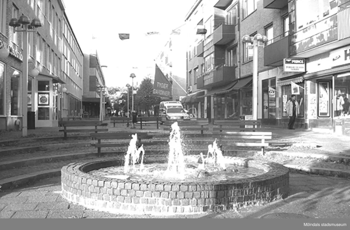 Fontänen i början av Brogatan. Mölndalsbro i dag - ett skolpedagogiskt dokumentationsprojekt på Mölndals museum under oktober 1996. 1996_1061-1076 är gjorda av högstadieelever från Kvarnbyskolan 9C, grupp 3. Se även 1996_0913-0940, gruppbilder på klasserna 1996_1382-1405 samt bilder från den färdiga utställningen 1996_1358-1381.
