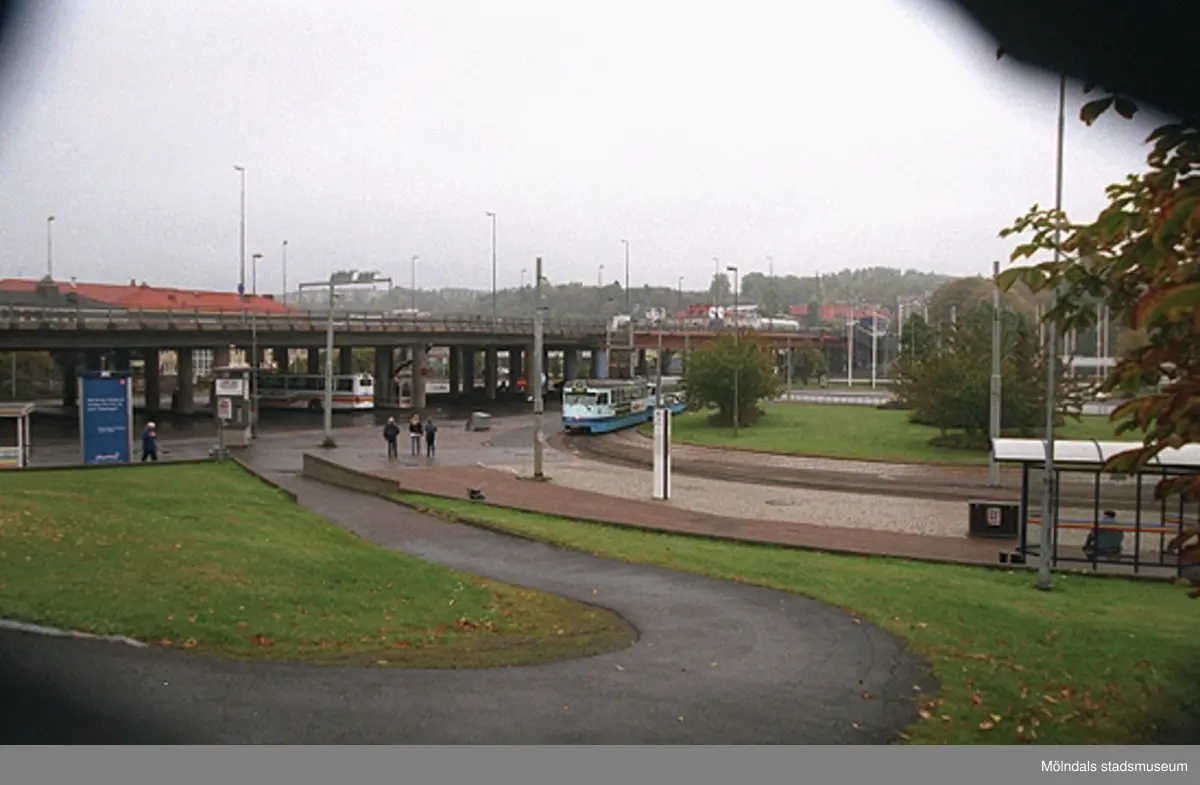 Vy åt nordost mot bron, Broplatsen samt spårvägens vändhållplats. Mölndalsbro i dag - ett skolpedagogiskt dokumentationsprojekt på Mölndals museum under oktober 1996. 1996_1153-1171 är gjorda av högstadieelever från Kvarnbyskolan 9D, grupp 2. Se även 1996_0913-0940.