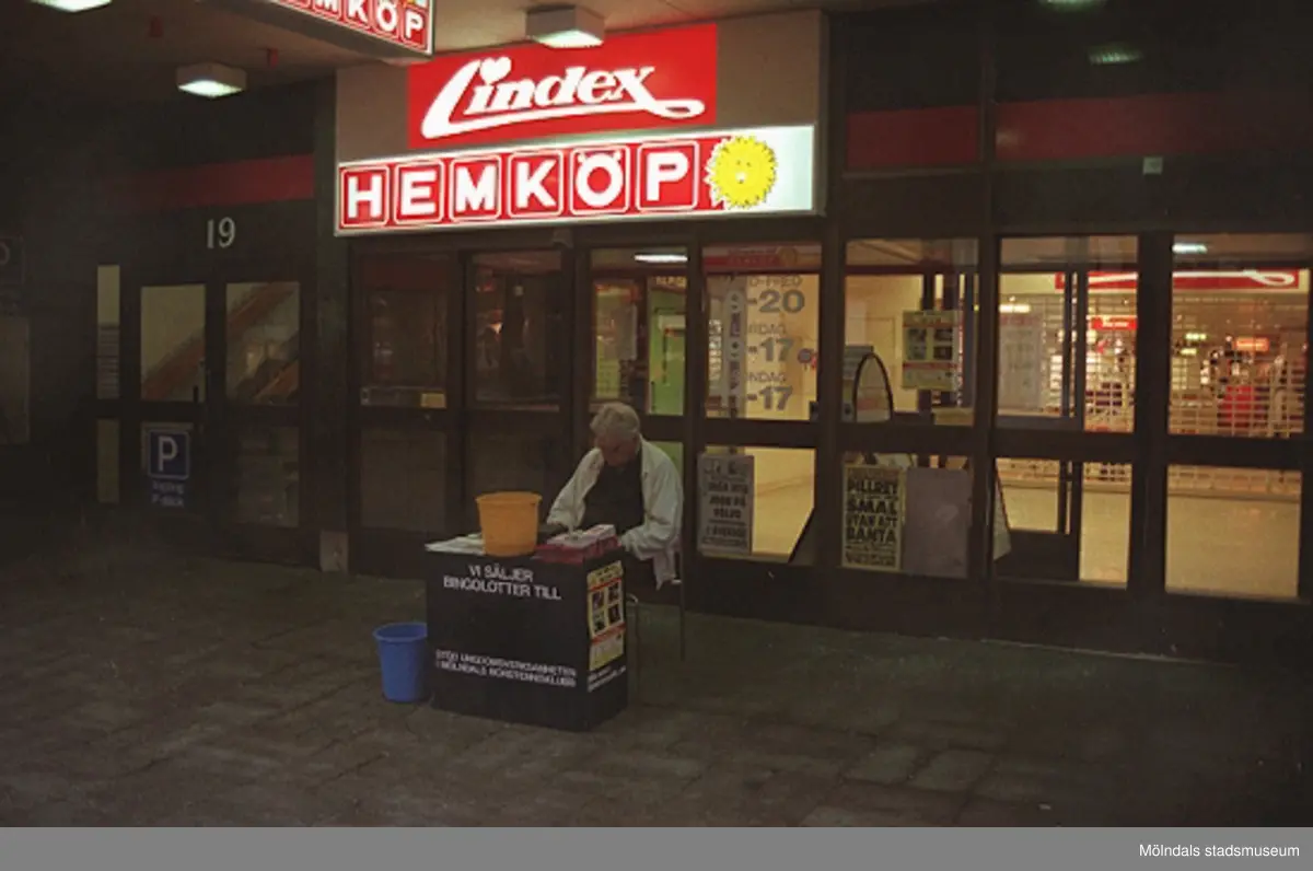 Försäljning av Bingolotter utanför Lindex och Hemköp på Brogatan. Mölndalsbro i dag - ett skolpedagogiskt dokumentationsprojekt på Mölndals museum under oktober 1996. 1996_1173-1187 är gjorda av högstadieelever från Kvarnbyskolan 9D, grupp 3. Se även 1996_0913-0940.